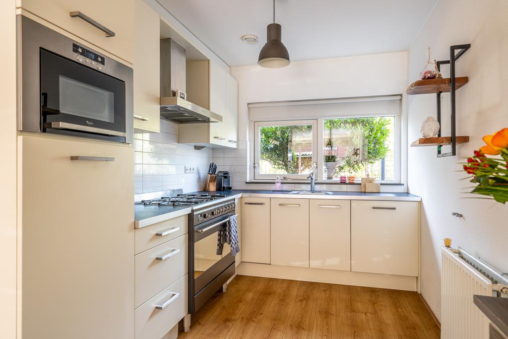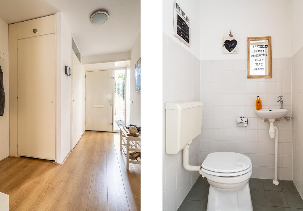 Via de entree kom je in de ruime hal welke toegang geeft tot het toilet, de meterkast, woonkamer en trapopgang naar boven. Het toilet is netjes in grijs/wit kleurstelling en voorzien van fonteintje. Over de gehele begane is een keurige laminaatvloer gelegd. De keuken ligt aan de voorzijde en is in hoekopstelling. De keuken is strak en voorzien van alle gemakken zoals vaatwasser, SMEG fornuis met 6 gaspitten en extra brede oven, combimagnetron , koel/vries-combinatie en een rvs afzuigkap. Door de opstelling aan de voorzijde kijk je tijdens het keuken fijn weg over het looppad aan de voorzijde van het huis.