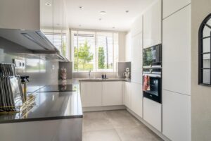 De keuken ligt aan de voorzijde en is in U-opstelling. De keuken is luxe afgewerkt met veel bergruimte en voorzien van alle gemakken zoals vaatwasser, brede inductieplaat met flexzone, een aparte oven en magnetron, extra grote Quooker boiler met ingebouwd zeeppompje, een extra grote koelkast en een vrieskast. Werkelijk overal is aan gedacht. Alle keukenapparatuur is van Siemens. Door de opstelling aan de voorzijde kijk je tijdens het keuken fijn weg naar buiten. Hier kun je heerlijk kokkerellen.