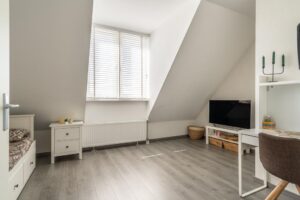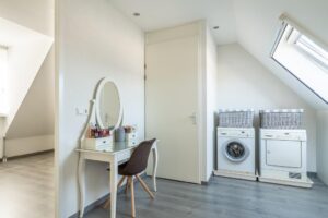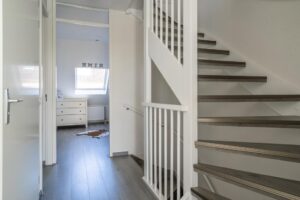 De trap naar de tweede verdieping is ook mooi bekleed. De tweede verdieping is keurig verbouwd. Zo is een extra, ruime slaapkamer gecreëerd aan de voorzijde met dakkapel. Aan de achterkant vind je de ruime voorzolder met een laundry. Dit kan prima als werkplek worden ingezet. Daar bovenop is met vlizotrap een bergzolder te betreden waar je heel veel spullen kunt opslaan. Hier is op de hele verdieping laminaat gelegd en zijn de wanden mooi afgewerkt.