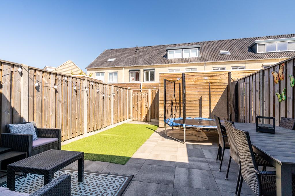 De tuin ligt op het noorden en is heerlijk om einde middag in de zon te genieten. De tuin is voorzien van keurige bestrating en kunstgras en achterop het perceel staat een houten berging met voldoende bergruimte voor fietsen en gereedschap. De tuin is via een achterom te bereiken.