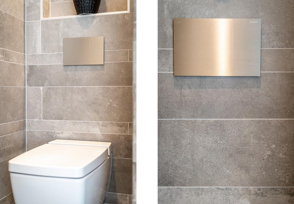 De badkamer is luxe uitgevoerd en tot het plafond betegeld. Deze is voorzien van een extra brede inloopdouche met bankje en een nis om shampoo op te bergen en een extra grote regendouche, een wastafel met dubbele kranen weggewerkt in de muur en een toilet met prachtige afdekplaat. Ook hier vind je vloerverwarming wat de ruimte comfortabel maakt.