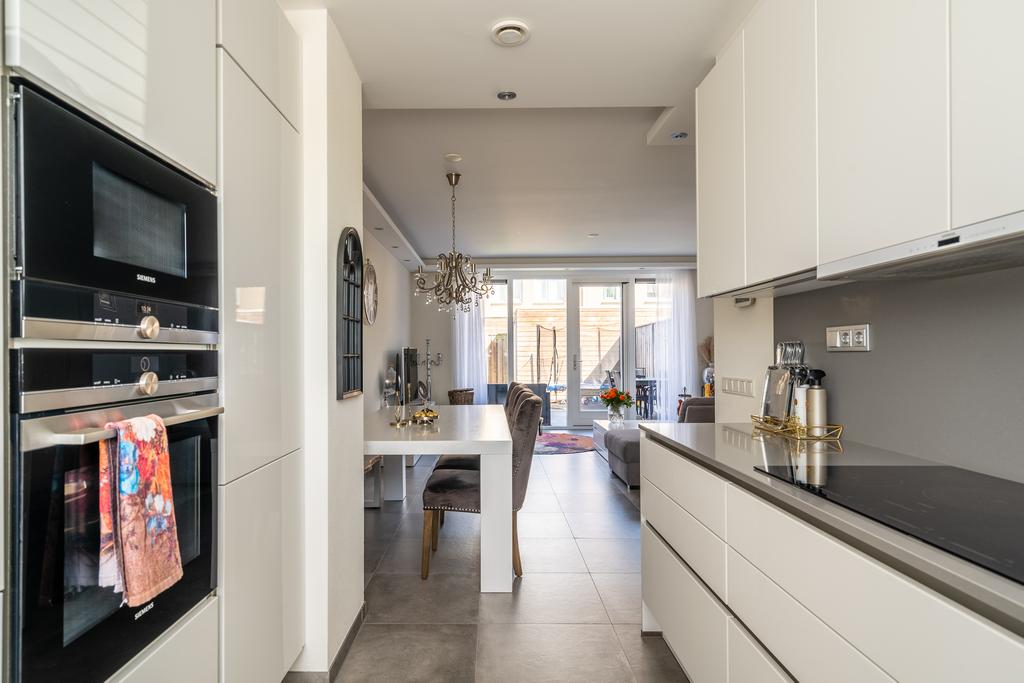De keuken ligt aan de voorzijde en is in U-opstelling. De keuken is luxe afgewerkt met veel bergruimte en voorzien van alle gemakken zoals vaatwasser, brede inductieplaat met flexzone, een aparte oven en magnetron, extra grote Quooker boiler met ingebouwd zeeppompje, een extra grote koelkast en een vrieskast. Werkelijk overal is aan gedacht. Alle keukenapparatuur is van Siemens. Door de opstelling aan de voorzijde kijk je tijdens het keuken fijn weg naar buiten. Hier kun je heerlijk kokkerellen.