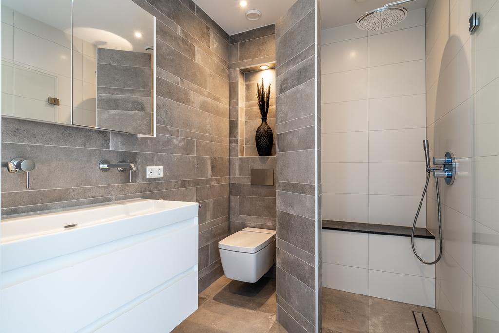 De badkamer is luxe uitgevoerd en tot het plafond betegeld. Deze is voorzien van een extra brede inloopdouche met bankje en een nis om shampoo op te bergen en een extra grote regendouche, een wastafel met dubbele kranen weggewerkt in de muur en een toilet met prachtige afdekplaat. Ook hier vind je vloerverwarming wat de ruimte comfortabel maakt.