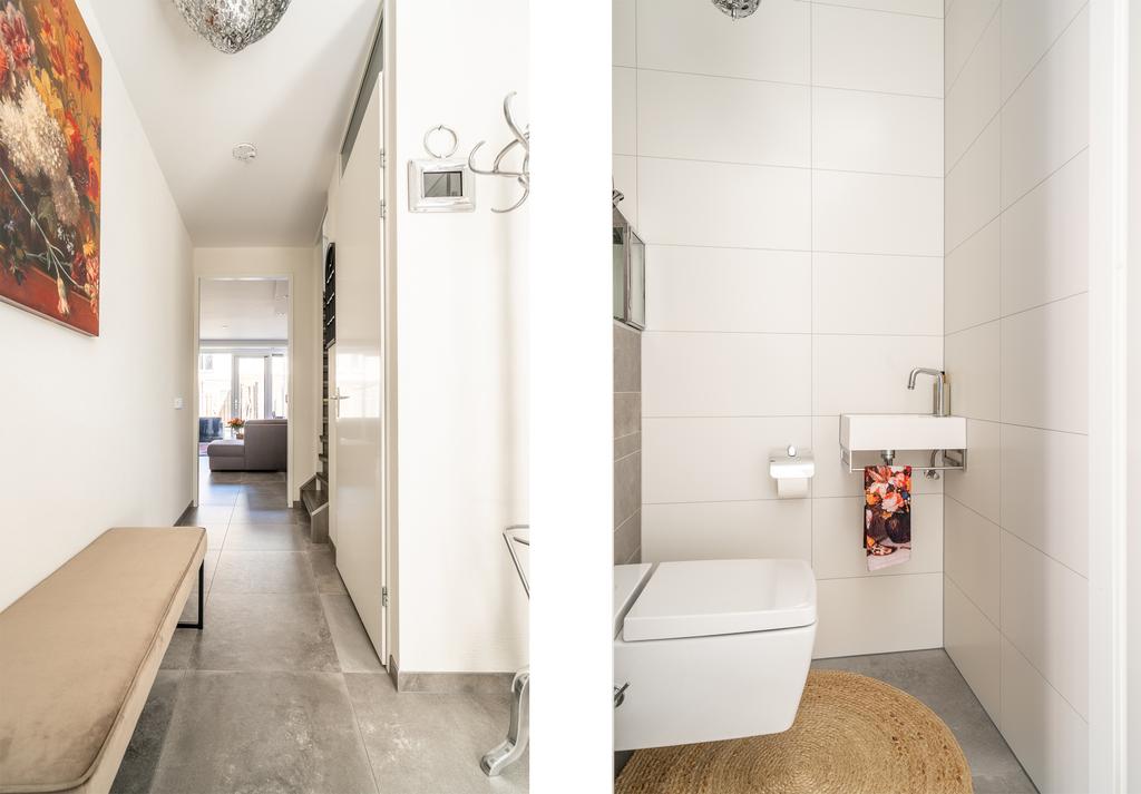 De bestrate voortuin met opgemetseld tussenmuurtje in de stijl van het huis, geeft toegang tot de entree. Via de entree kom je in de ruime hal welke toegang geeft tot het keurig afgewerkte toilet, de meterkast met maar liefst 11 groepen, woonkamer en trapopgang naar boven. Het toilet is netjes in grijs/wit kleurstelling en voorzien van fonteintje en een mooie afdekplaat. Over de gehele begane is een mooie tegelvloer gelegd inclusief vloerverwarming. De mooi geïntegreerde en weggewerkte verlichting maakt de sfeer in de woning af en kun je instellen op koele of warme lichttinten.