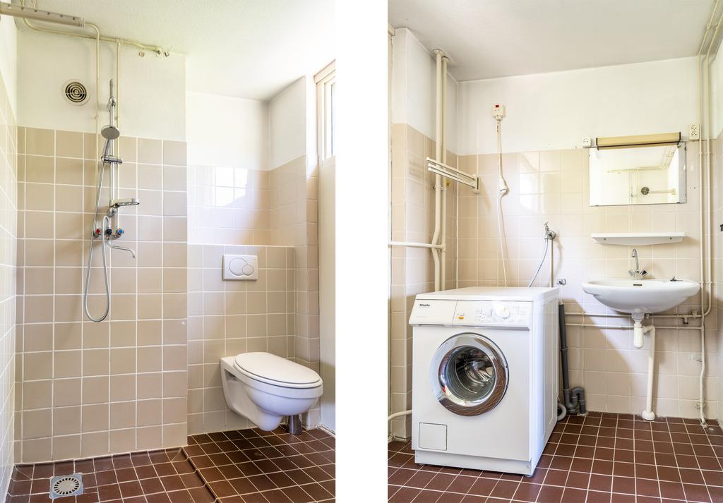 De badkamer is eenvoudig maar goed onderhouden en voorzien van douche, toilet, wastafel en wasmachineaansluiting. Het raam zorgt voor de natuurlijk ventilatie en fijne lichtinval.