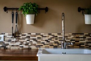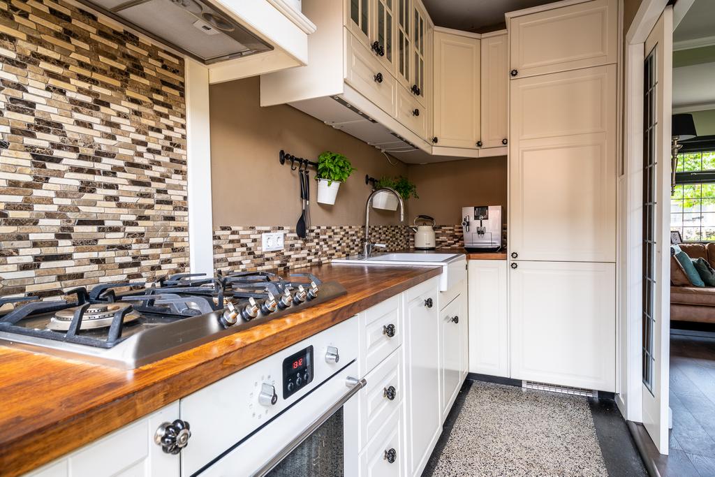 De open keuken is gelegen aan de achterzijde en ademt één en al sfeer uit. De keuken heeft een granieten vloer, keramieken wasbak en houten werkblad. Samen met de koof, deurknopjes en kastdeurtjes resulteert het in een fraaie landelijke uitstraling. Dit is met recht een gezellige plek om te zijn en heerlijk te koken voor vrienden en familie. De keuken is verder voorzien van de benodigde inbouwapparatuur zoals een 5-pits SMEG gaskookplaat, een oven, vaatwasser en een koel/vriescombinatie. Een fraai detail dat het geheel afmaakt, is dat de keuken ook kan worden afgesloten door karakteristieke en-suitedeuren met glas-in-lood. De keuken heeft tenslotte nog een deur naar de tuin waar je op je eerste grote terras uitkomt aan de achtergevel van het huis. Hier schijnt in de ochtend volop de zon dus is het de ideale plek voor je ontbijt of je eerste kop koffie.