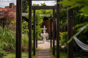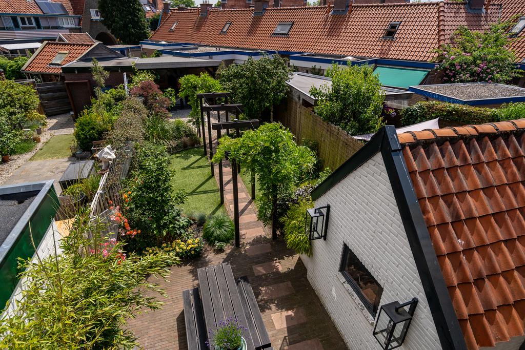 Dit huis heeft de diepste tuin van de Marconistraat! De diepe achtertuin (maar liefst 22 m) ligt op het oosten en biedt veel zon. Doordat de percelen achter het huis haaks erop liggen, is de tuin erg vrij gelegen, dus je geniet hier volop privacy. De tuin is prachtig aangelegd met een pergola waardoor je nog meer diepte ervaart in de tuin. De pergola is begroeid met blauwe regen en over de schuttingen bloeien prachtige clematissen. Achter in de tuin staat een heerlijke overkapping, een verlengstuk van je leefruimte en een haardhoutopslag voor de houtkachel. Door de diverse beplanting, vele bloemen en overkapping achter op het perceel waan je je hier echt op vakantie.