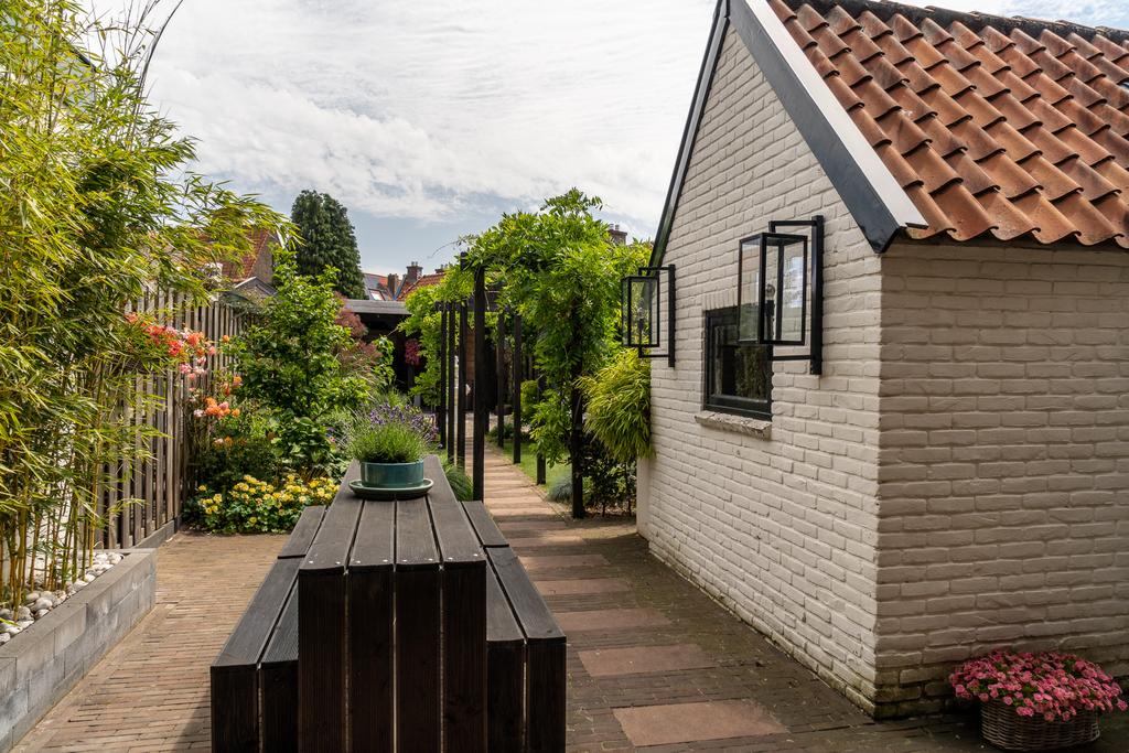 Via de fraai aangelegde tuin kom je bij de karakteristieke voorgevel. De gevel van de woning springt eruit met zijn fraaie glas-in-lood ramen. Voor het huis is het ideale plekje voor een bankje of picknicktafel. Hier geniet je van de middag- en avondzon terwijl je kinderen lekker op straat spelen.
