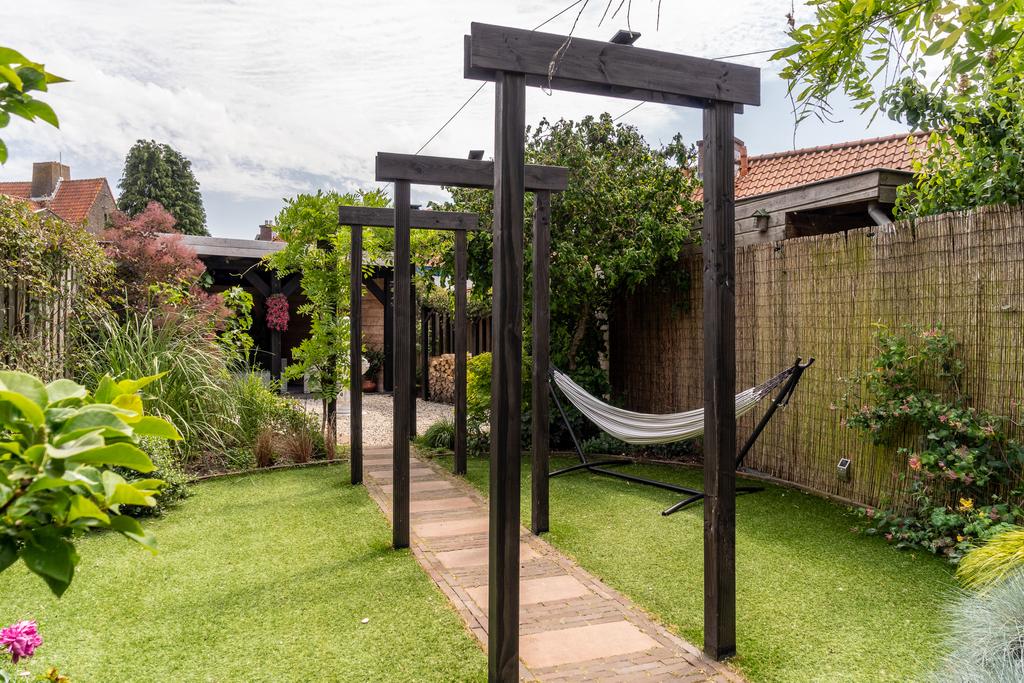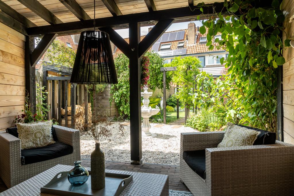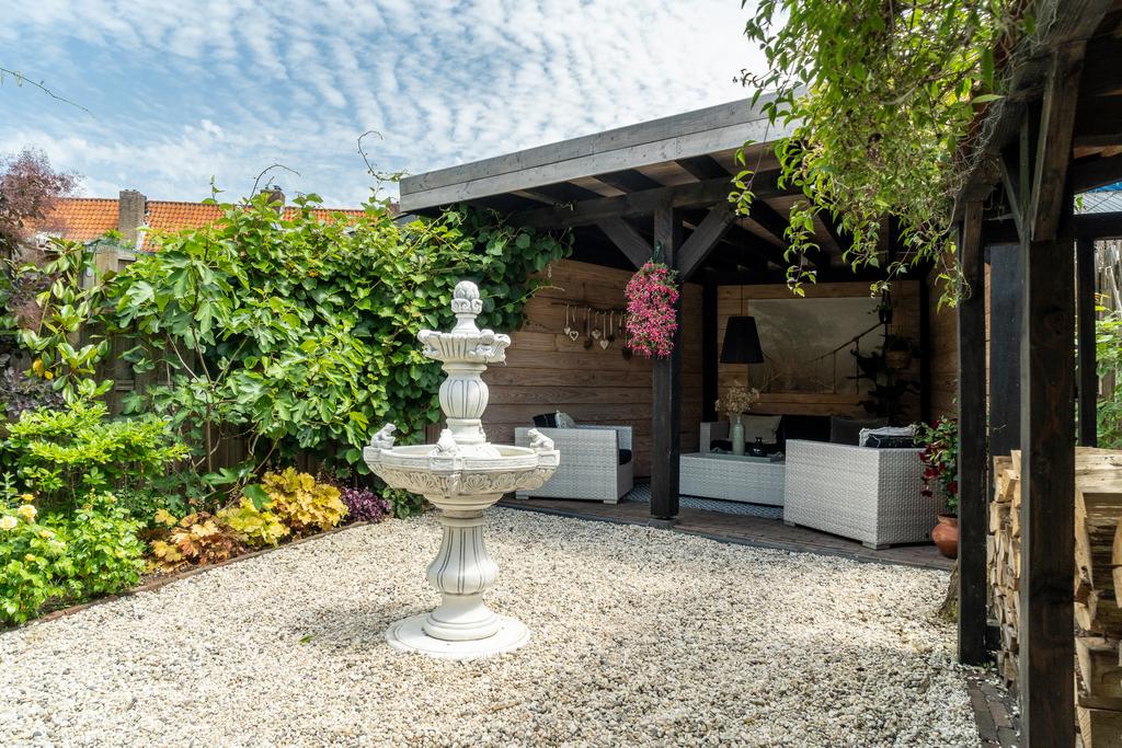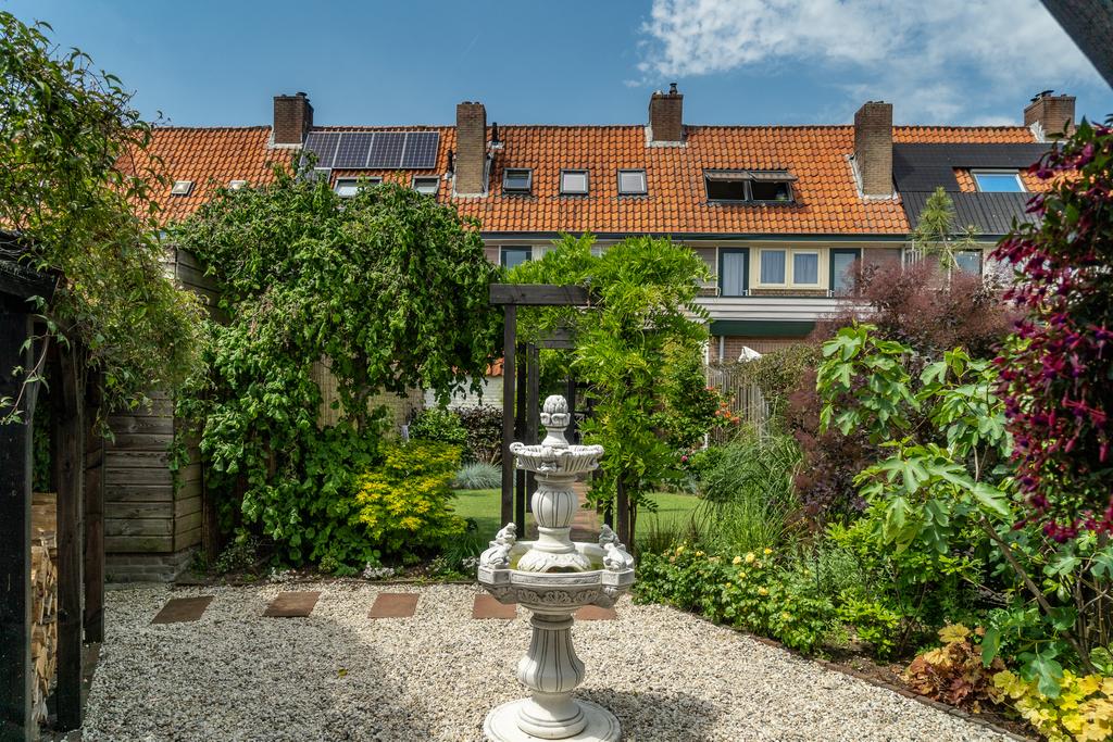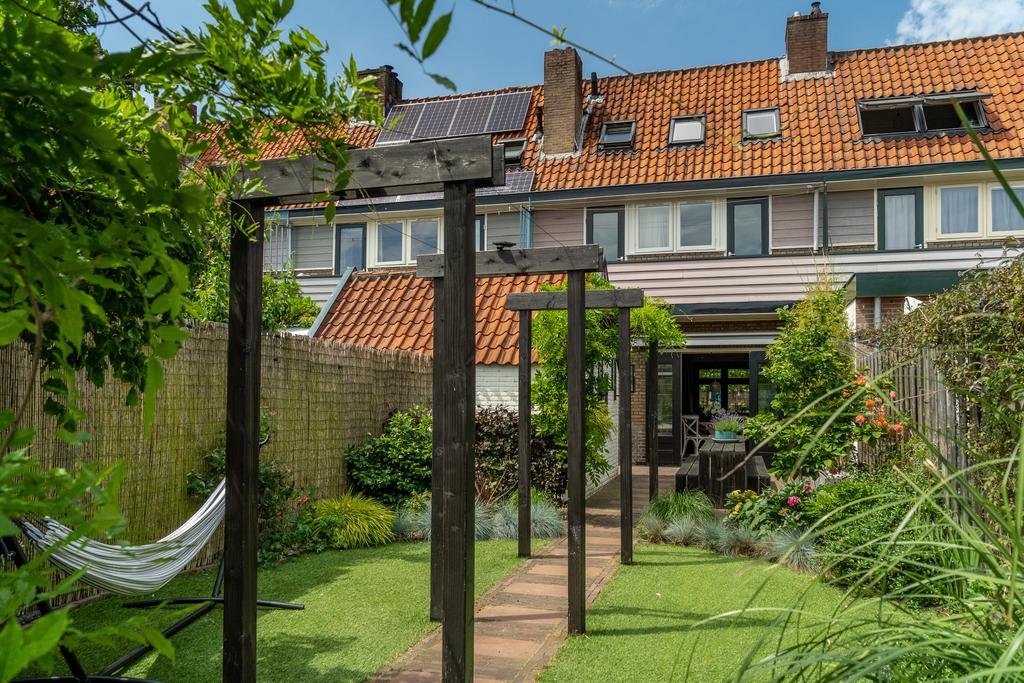 Dit huis heeft de diepste tuin van de Marconistraat! De diepe achtertuin (maar liefst 22 m) ligt op het oosten en biedt veel zon. Doordat de percelen achter het huis haaks erop liggen, is de tuin erg vrij gelegen, dus je geniet hier volop privacy. De tuin is prachtig aangelegd met een pergola waardoor je nog meer diepte ervaart in de tuin. De pergola is begroeid met blauwe regen en over de schuttingen bloeien prachtige clematissen. Achter in de tuin staat een heerlijke overkapping, een verlengstuk van je leefruimte en een haardhoutopslag voor de houtkachel. Door de diverse beplanting, vele bloemen en overkapping achter op het perceel waan je je hier echt op vakantie.