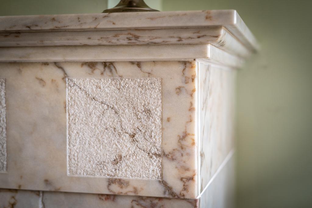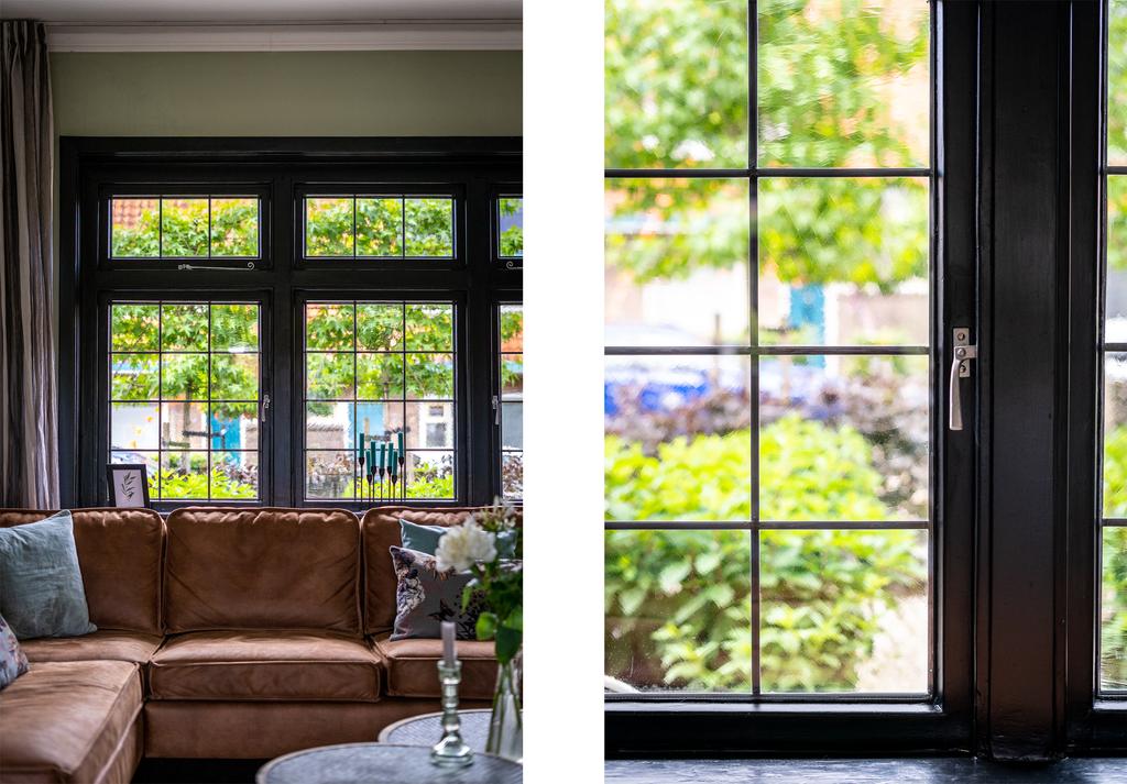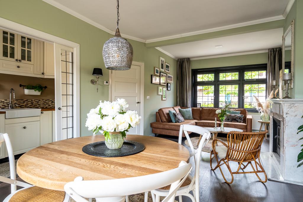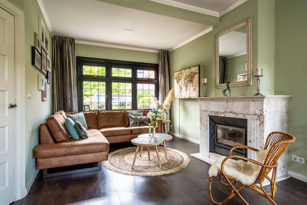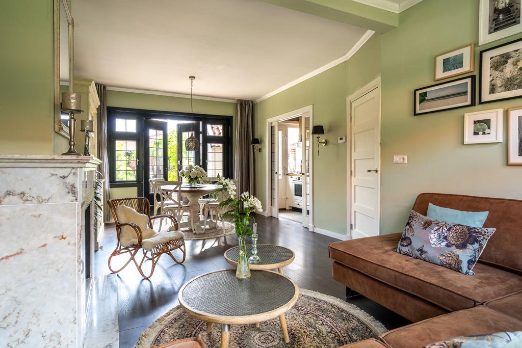 De woonkamer heeft een sfeervolle donkere vloer en een fraaie marmeren haardschouw met houtkachel. Aan de voorzijde is een fijne plek voor een zitgedeelte en aan de achterzijde is de ideale plek voor de eettafel. Wat opvalt zijn de fraaie glas-in-lood ramen. De eigenaar heeft het originele glas-in-lood laten restaureren en in dubbel glas laten plaatsen. Je voelt direct dat dit huis met liefde is gerenoveerd. De sierlijsten op het plafond en de openslaande deuren aan de achterzijde naar de tuin maken het geheel af.
