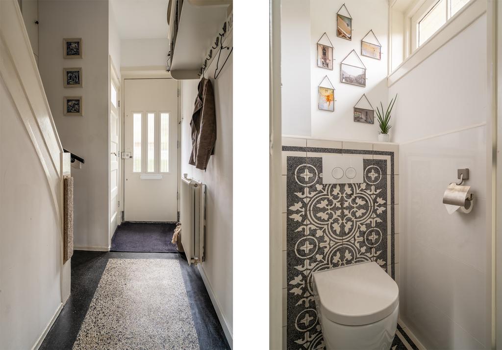 Bij binnenkomst in de hal zie en proef je de sfeer die deze woningen zo populair maakt; de granito vloer, de paneeldeuren en het hoge plafond geven veel sfeer. Het valt direct op dat de karakteristieke sfeer wordt gecombineerd met hedendaagse strakheid. De plafonds en wanden zijn glad gestuukt, de trap is bekleed met zwart tapijt. In de hal vind je een volledig vernieuwde meterkast, een mooi afgewerkt toilet (2015) en een handige bergkast onder de trap.