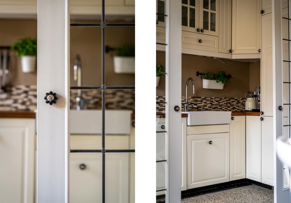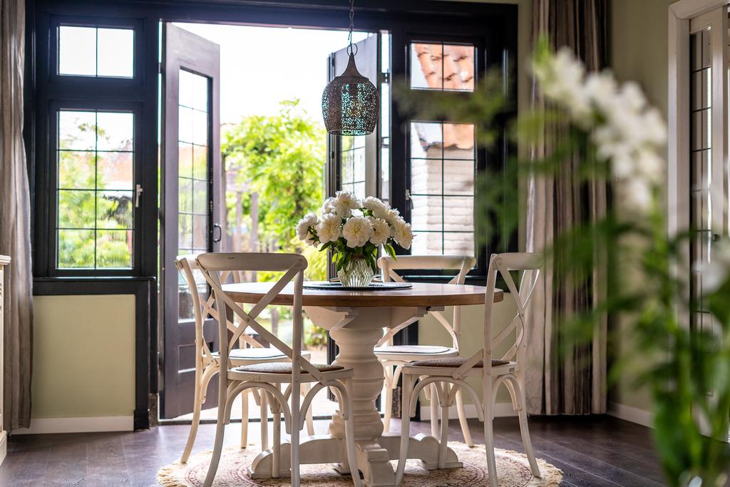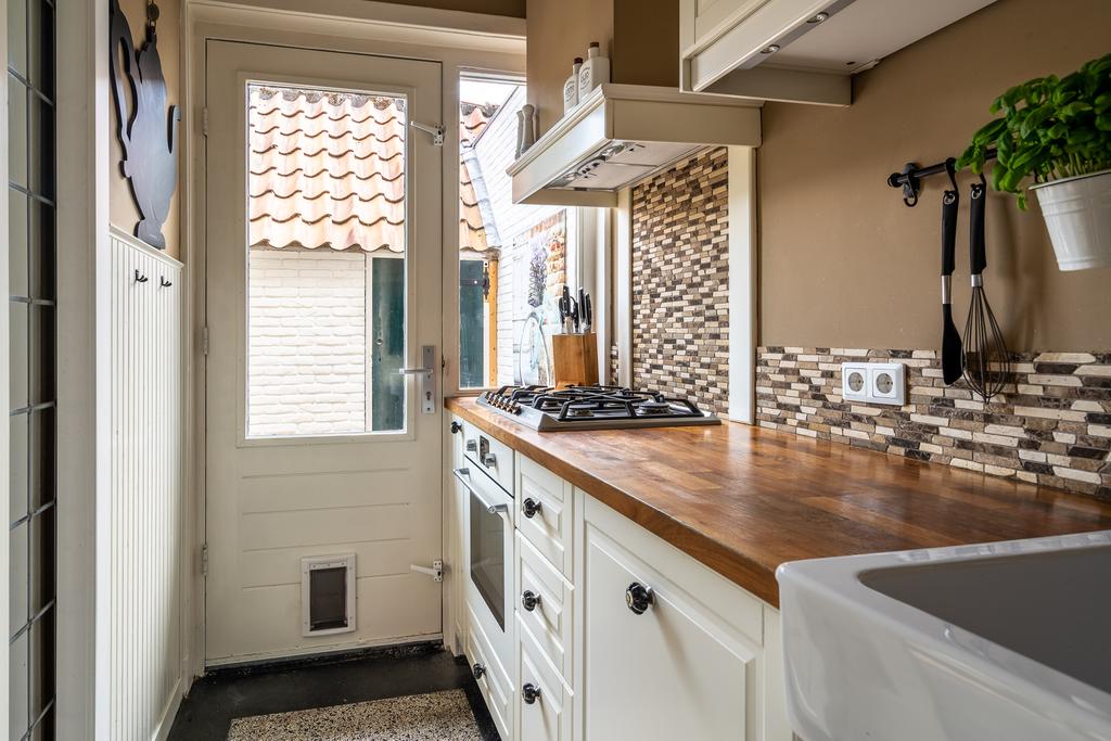 De open keuken is gelegen aan de achterzijde en ademt één en al sfeer uit. De keuken heeft een granieten vloer, keramieken wasbak en houten werkblad. Samen met de koof, deurknopjes en kastdeurtjes resulteert het in een fraaie landelijke uitstraling. Dit is met recht een gezellige plek om te zijn en heerlijk te koken voor vrienden en familie. De keuken is verder voorzien van de benodigde inbouwapparatuur zoals een 5-pits SMEG gaskookplaat, een oven, vaatwasser en een koel/vriescombinatie. Een fraai detail dat het geheel afmaakt, is dat de keuken ook kan worden afgesloten door karakteristieke en-suitedeuren met glas-in-lood. De keuken heeft tenslotte nog een deur naar de tuin waar je op je eerste grote terras uitkomt aan de achtergevel van het huis. Hier schijnt in de ochtend volop de zon dus is het de ideale plek voor je ontbijt of je eerste kop koffie.