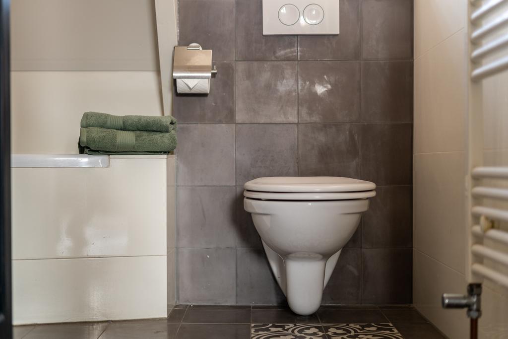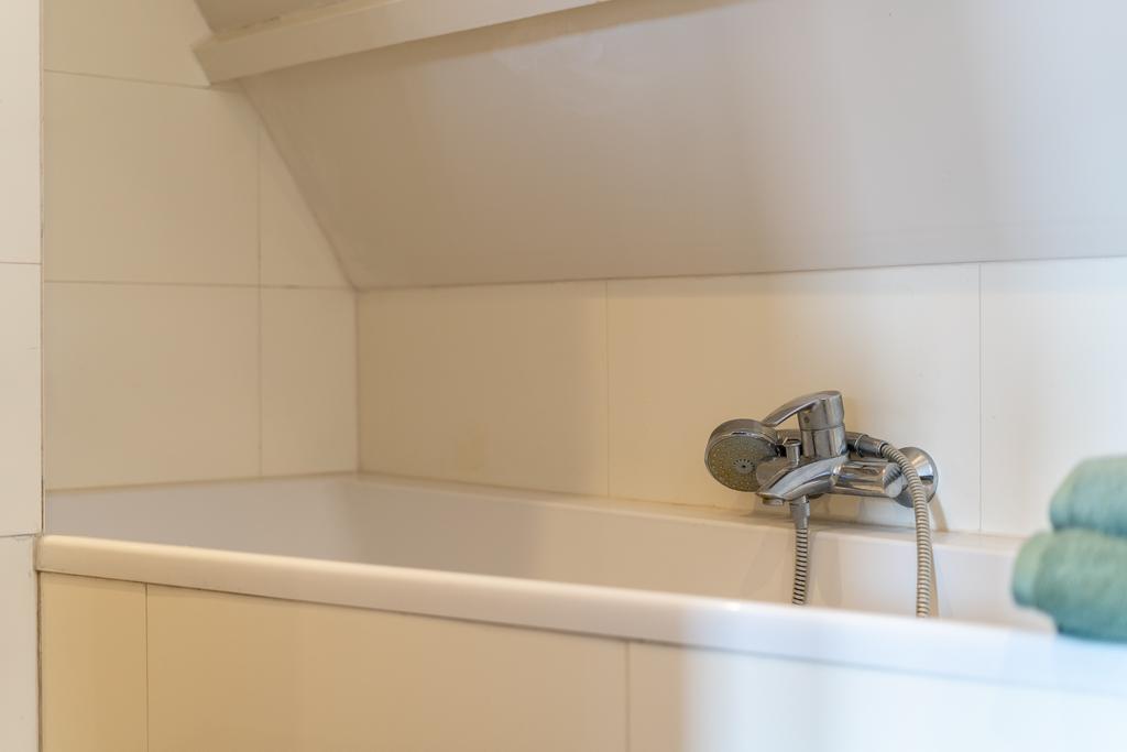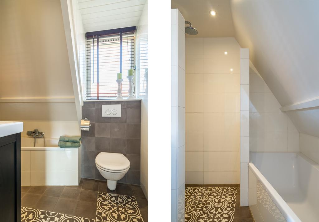 In de moderne badkamer is ingenieus gebruikt gemaakt van de ruimte waardoor deze beschikt over zowel bad, inloopdouche, tweede toilet als en een wastafelmeubel. De tegelafwerking is in smaakvolle grijs/wit-tint met handgemaakte Portugese cementtegels en kent een strakke afwerking.