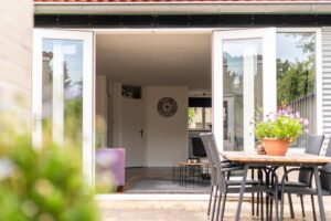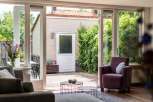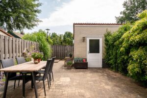 Via de openslaande deuren in de woonkamer bereik je de achtertuin, prettig gelegen op het Zuidoosten.