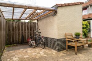In de tuin staat een handige stenen berging met erachter een overkapping om de fietsen droog te kunnen stallen. Zo hou je genoeg ruimte over in de berging zelf voor tuingereedschap en andere spullen.