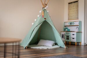 In de woonkamer ligt een keurige laminaatvloer. De grootte van de woonkamer (maar liefst 34 m2) biedt meer dan genoeg plek voor zowel een speel/werkplek, een grote eettafel en een zithoek. De openslaande deuren brengen je naar de achtertuin. Je hebt vrij zicht op de hoge groene bomen en blauwe luchten en je hebt geen achterburen die bij je naar binnen kijken door het brede pad en de laagbouw achter het huis.