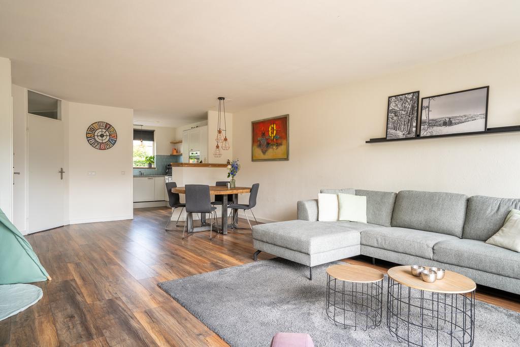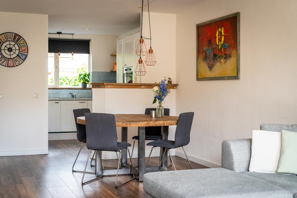 In de woonkamer ligt een keurige laminaatvloer. De grootte van de woonkamer (maar liefst 34 m2) biedt meer dan genoeg plek voor zowel een speel/werkplek, een grote eettafel en een zithoek. De openslaande deuren brengen je naar de achtertuin. Je hebt vrij zicht op de hoge groene bomen en blauwe luchten en je hebt geen achterburen die bij je naar binnen kijken door het brede pad en de laagbouw achter het huis.