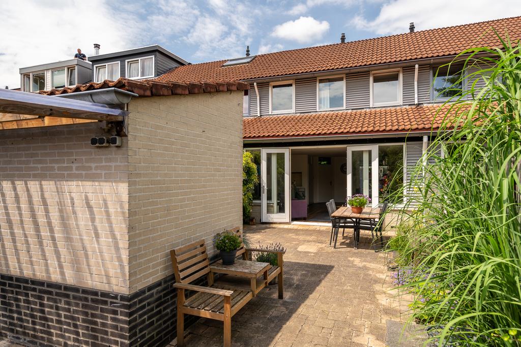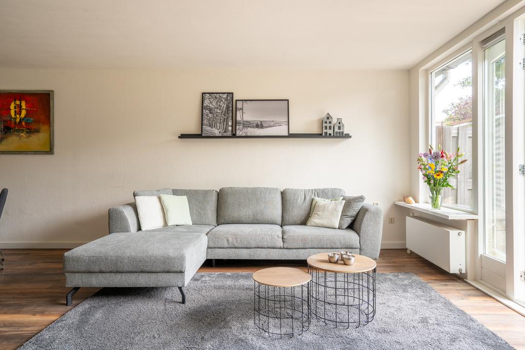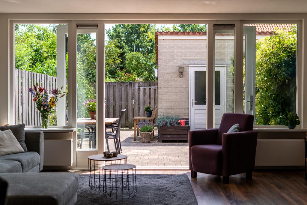Via de openslaande deuren in de woonkamer bereik je de achtertuin, prettig gelegen op het Zuidoosten.