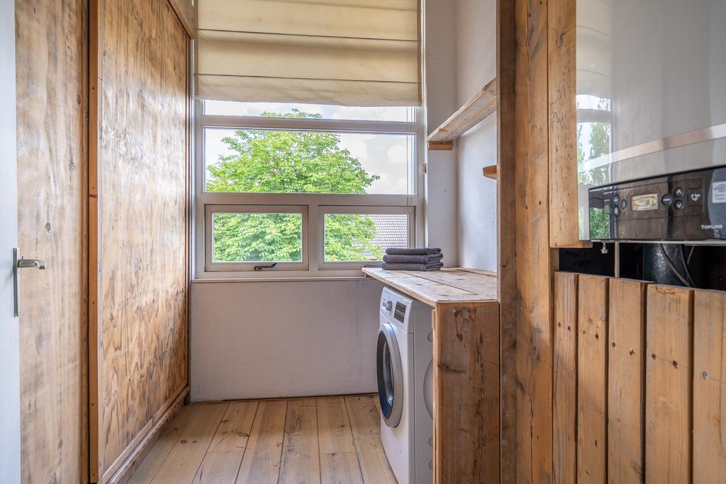 Op de voorzolder vind je een handige waskamer met wasmachine en droger aansluiting. Een grote steigerhouten kastenwand tot aan het plafond zorgt voor maximale opbergruimte voor alle bad- en bedlinnen of je seizoenkleding.