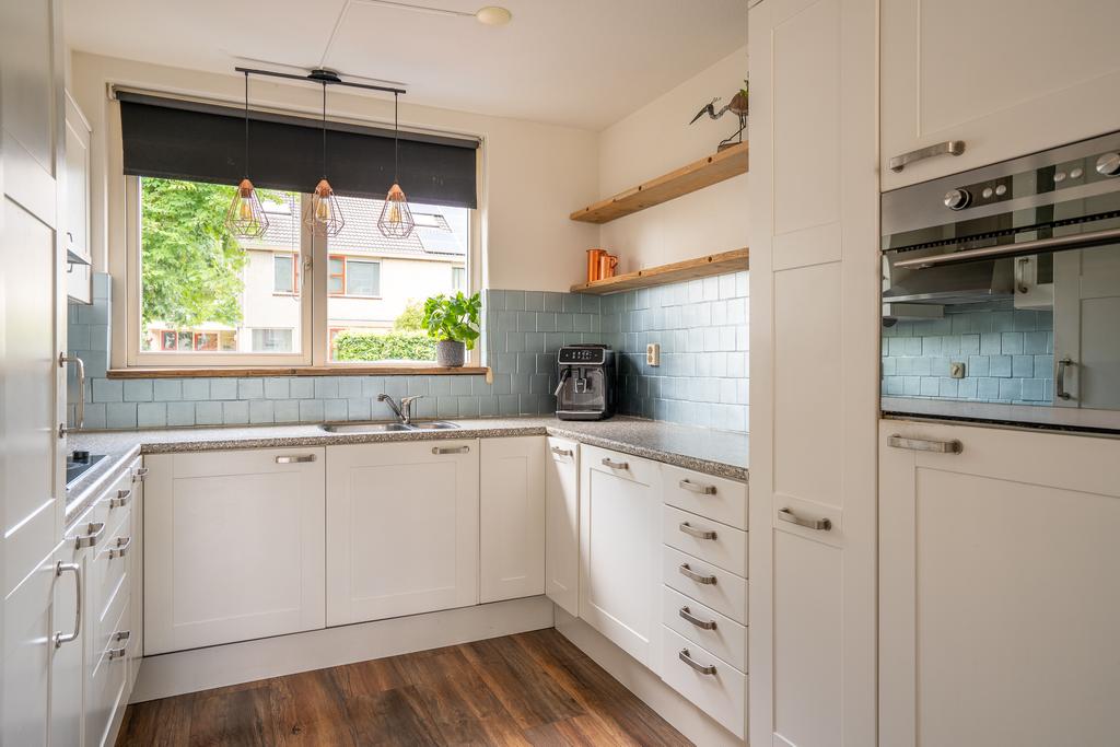 De open keuken in handige hoek-opstelling ligt aan de voorzijde en beschikt over diverse inbouwapparatuur waaronder koel-vriescombinatie, elektrische kookplaat en combi-oven. In de vele bovenkastjes en op de houten planken kan je veel servies, kookgerei en kookboeken kwijt. Het grote dubbele raam zorgt ervoor dat je tijdens het kokkerellen prettig weg kan kijken en fijn direct licht hebt over je aanrecht.