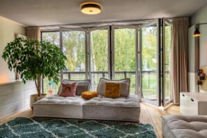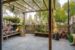 Via de schuifpui in de woonkeuken kom je op een heerlijk terras aan de achterzijde. Deze is gelegen aan het Park der Tijden. Aan de buitenkant van het terras is een leuk zitje gemaakt om te picknicken. De achtertuin ligt op het noordoosten.