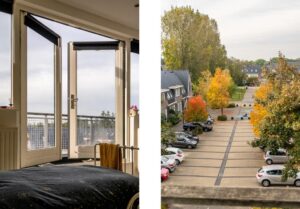 Met de trap kom je tenslotte op de vierde woonlaag met twee grote slaapkamers aan voor- en achterzijde over de gehele breedte van de woning. De kamer aan de voorzijde heeft een heerlijk dakterras van 6 m2. Met de ligging op het zuidwesten geniet je echt van de laatste zonnestralen tot zonsondergang.