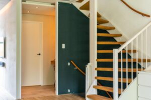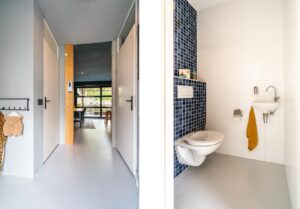 Via de entree kom je in de hal. Deze is ruim, heeft een handige nis voor de kapstok en geeft toegang tot een moderne en complete meterkast, toilet met fonteintje en toegang tot de woonkeuken.