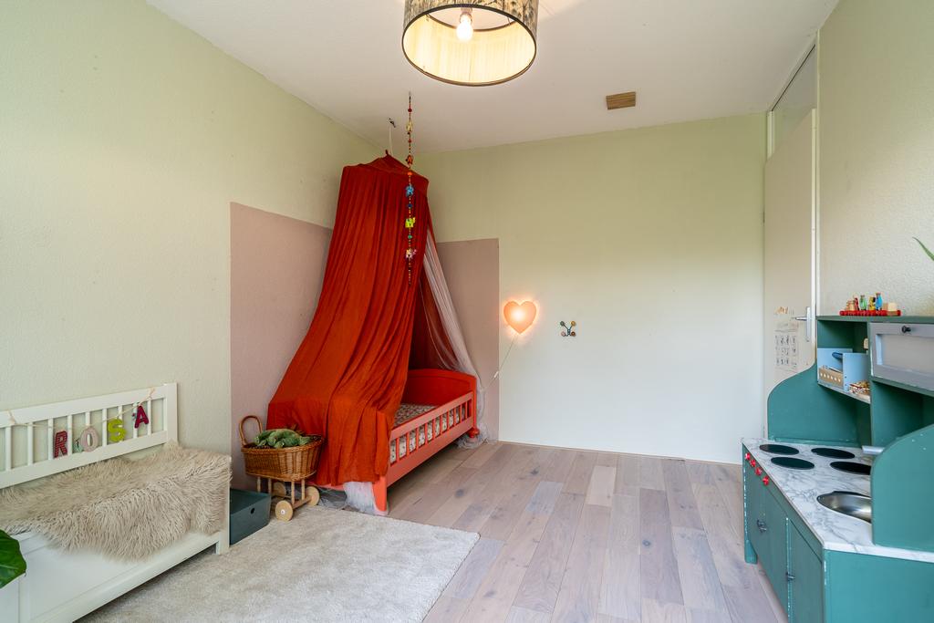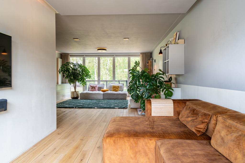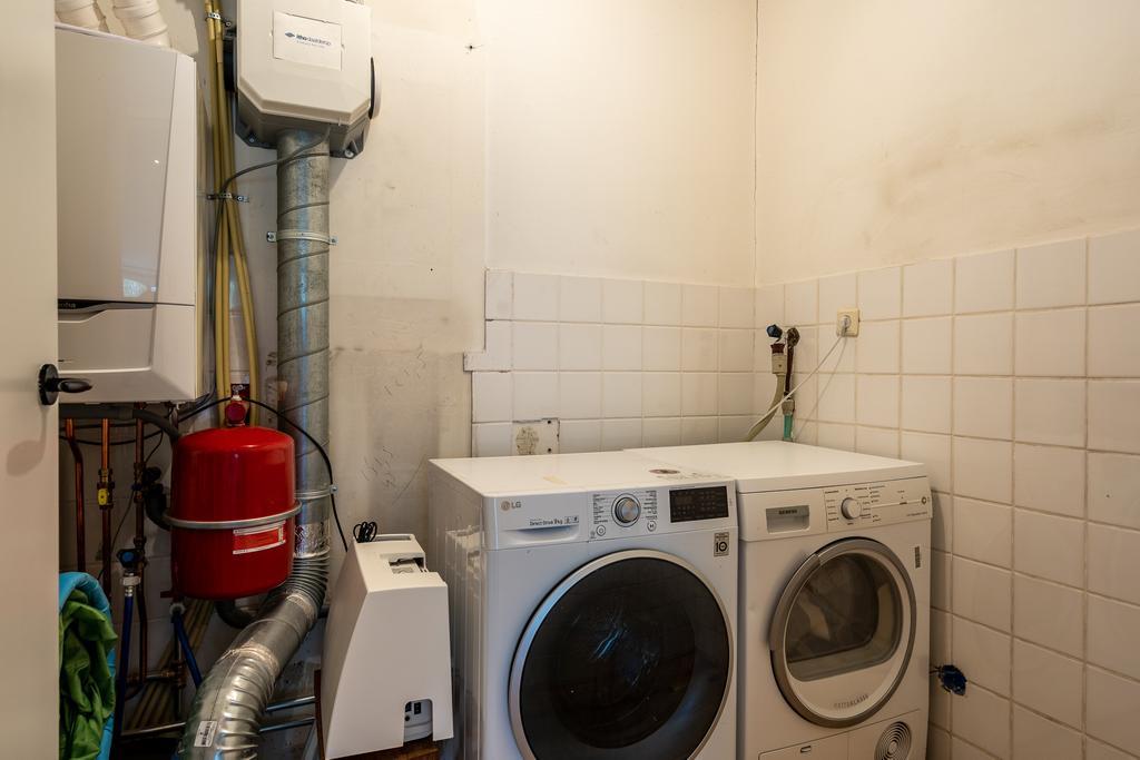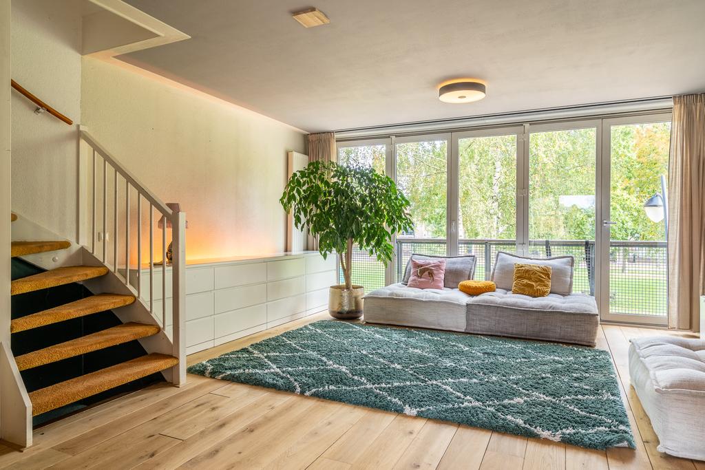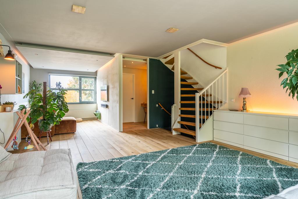 Via de trap in de keuken kom je op de tweede woonlaag. Wat een verrassend grote woonkamer! Met de prachtige, lichte, houten vloer en de harmonicadeuren is veel licht gecreëerd wat de ruimte nog groter doet aanvoelen. Er is genoeg ruimte voor een heerlijke bank en knusse hoekjes. In een van de hoekjes in een handige en praktische werkplek gecreëerd. Tenslotte vind je op deze verdieping nog de toegang tot de inpandige wasgelegenheid met wasmachine/droger aansluiting.