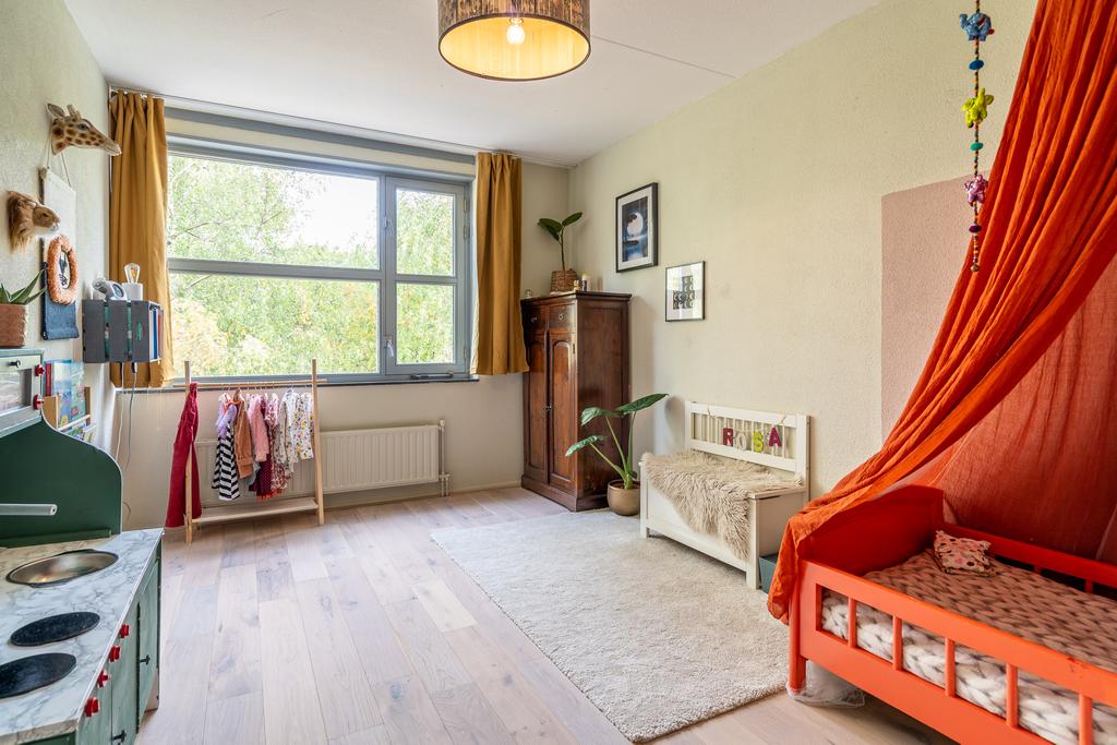 Met de trap kom je tenslotte op de vierde woonlaag met twee grote slaapkamers aan voor- en achterzijde over de gehele breedte van de woning. De kamer aan de voorzijde heeft een heerlijk dakterras van 6 m2. Met de ligging op het zuidwesten geniet je echt van de laatste zonnestralen tot zonsondergang.