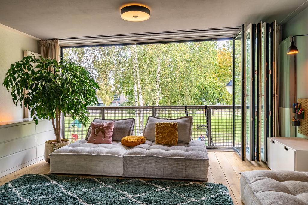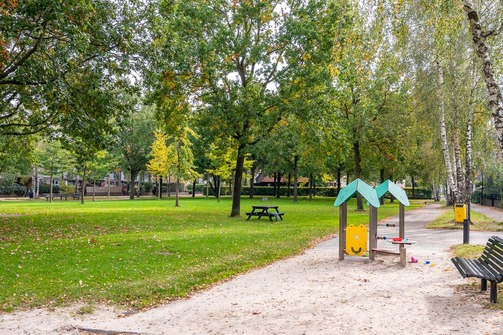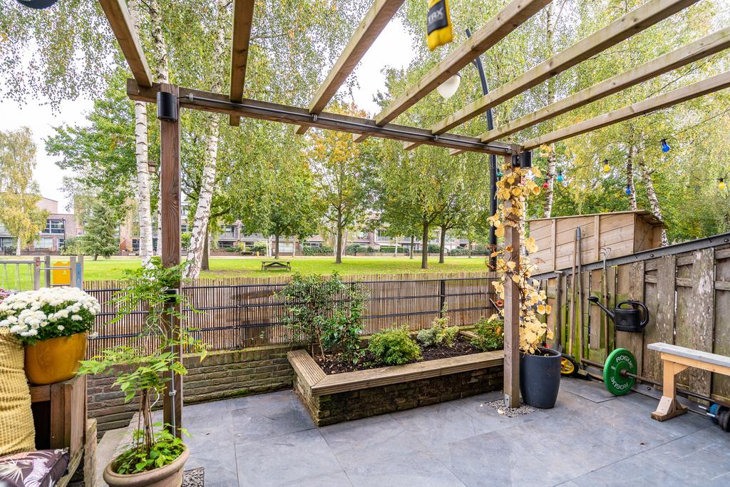 Via de schuifpui in de woonkeuken kom je op een heerlijk terras aan de achterzijde. Deze is gelegen aan het Park der Tijden. Aan de buitenkant van het terras is een leuk zitje gemaakt om te picknicken. De achtertuin ligt op het noordoosten.