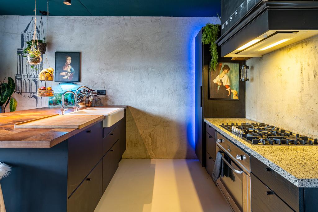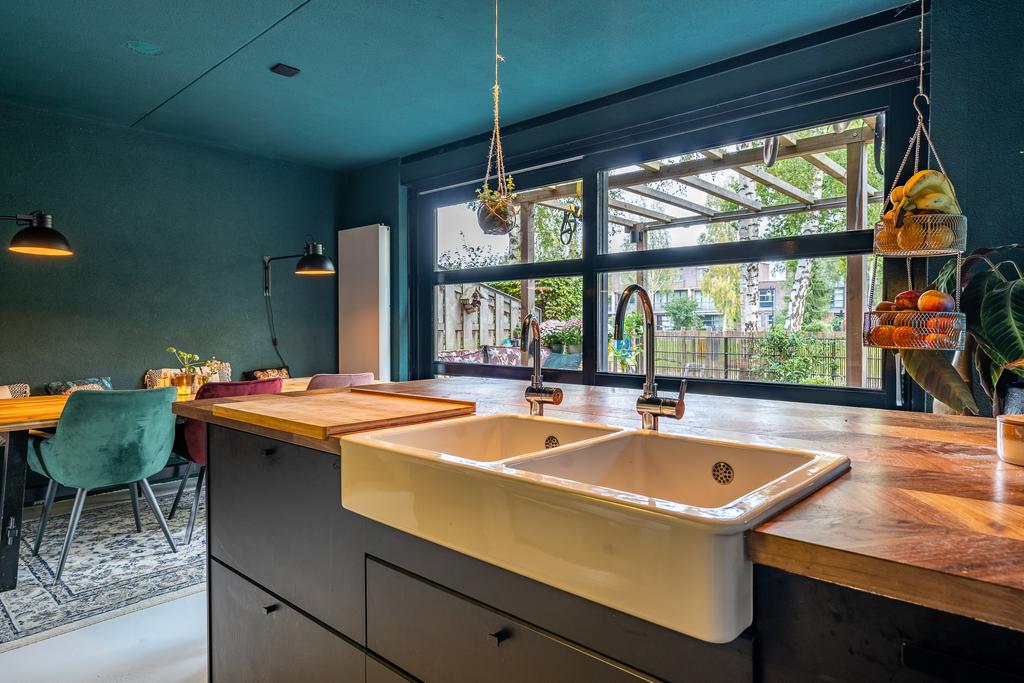 De sfeervolle woonkeuken bevindt zich aan de achterkant en heeft een prachtige, grote glaspui met schuifdeur naar het terras aan de achterzijde. Er ligt een fraaie gietvloer, strak en goed onderhouden. De woonkeuken is voorzien van luxe inbouwapparatuur zoals vaatwasser, koelkast, 5 pits gasfornuis, afzuigkap en een grote oven. Er is meer dan genoeg ruimte voor een grote eettafel. Dit is met recht de ideale plek om lange avonden te tafelen met vrienden of familie.
