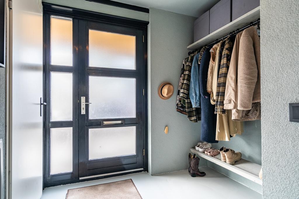 Via de entree kom je in de hal. Deze is ruim, heeft een handige nis voor de kapstok en geeft toegang tot een moderne en complete meterkast, toilet met fonteintje en toegang tot de woonkeuken.