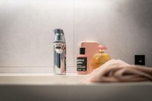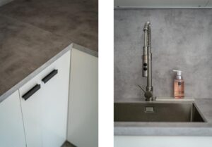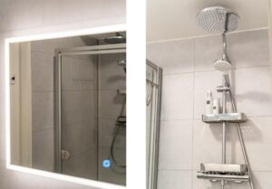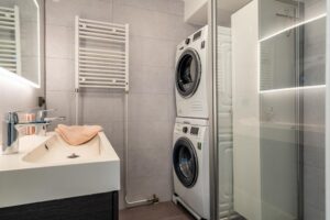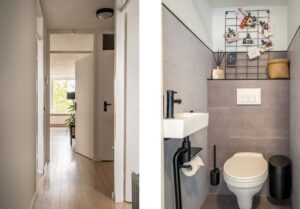 Via de hal kun je de mooie badkamer met dubbele wastafel, inloopdouche en wasmachine/droger opstelling bereiken. Ernaast is een separaat toilet in dezelfde mooie neutrale kleurstelling gemaakt.