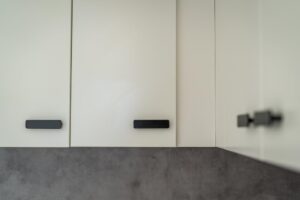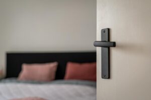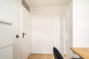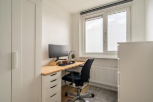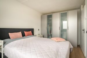 Aan de achterzijde van het appartement liggen de twee slaapkamers van 12m2 en van 6m2. De grote slaapkamer heeft voldoende ruimte voor een mooie garderobekast.