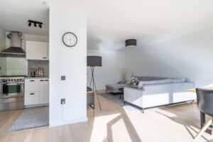 Het gehele appartement is voorzien van goed afgewerkte wanden en plafonds en over de gehele vloer ligt laminaat. De woonkamer ligt aan de achterzijde. Deze is ruim en fijn licht door de grote raampartij. Je kijkt heerlijk vrij uit over de omgeving. Grenzend aan de woonkamer bevindt zich de halfopen keuken met toegang tot het balkon dat gelegen is op het zuiden. Door de zonligging en het feit dat het appartement zich op de bovenste verdieping bevindt, kan je hier lang genieten van de zon.