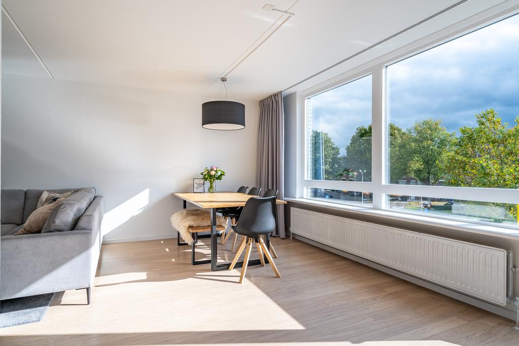 Het gehele appartement is voorzien van goed afgewerkte wanden en plafonds en over de gehele vloer ligt laminaat. De woonkamer ligt aan de achterzijde. Deze is ruim en fijn licht door de grote raampartij. Je kijkt heerlijk vrij uit over de omgeving. Grenzend aan de woonkamer bevindt zich de halfopen keuken met toegang tot het balkon dat gelegen is op het zuiden. Door de zonligging en het feit dat het appartement zich op de bovenste verdieping bevindt, kan je hier lang genieten van de zon.
