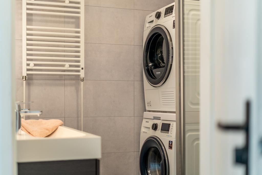 Via de hal kun je de mooie badkamer met dubbele wastafel, inloopdouche en wasmachine/droger opstelling bereiken. Ernaast is een separaat toilet in dezelfde mooie neutrale kleurstelling gemaakt.