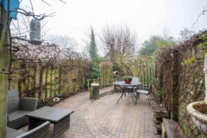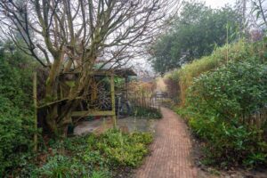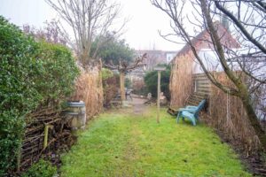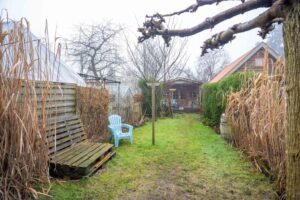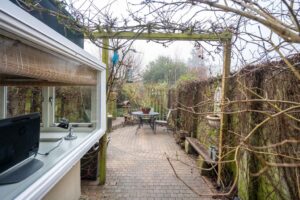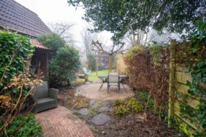 In de voortuin, met klinkers bestraat, staan 2 mooie bolcatalpa’s. Het is het ideale plekje voor een leuk bankje. Met een kop koffie in de hand praat je hier gezellig bij met je buren of hou je een oogje in het zeil als je kinderen op straat spelen, hier kan dat nog.