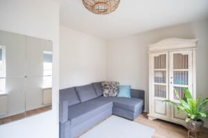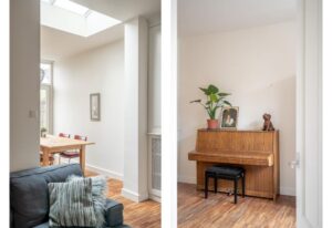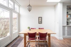 De woonkamer is voorzien van een houten vloer en de grote ramen en hoge plafonds geven veel licht en een ruimtelijk gevoel. Aan de voorzijde heb je een fijne plek voor een leesstoel of speelplek voor de kleintjes. Loop je door naar achteren dan kom je in de ruime zitkamer, die is gecentreerd rondom de haard.De houthaard geeft sfeer en warmte voor de gezellige winteravonden en is de ideale plek voor een grote zitbank.