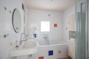Via de trapopgang in de hal kom je op de eerste verdieping. Hier vind je twee ruime slaapkamers en de badkamer. De badkamer is netjes, fijn licht door het gevelraam en voorzien van ligbad, douche en wastafel.