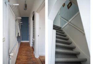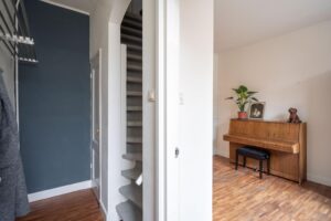 Via de entree kom je in de hal met trapopgang naar boven en toegang tot de keuken en woonkamer.