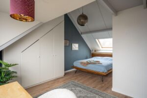 Op de voorzolder vind je de aansluitingen voor wasmachine en droger en veel bergruimte. Verder vind je hier een grote slaapkamer van maar liefst 20 m2. De kamer beschikt over veel vaste kasten en het grote raam van de dakkapel geeft een fantastisch uitzicht over de wijk, het bos Klein Zwitserland en de kerktoren. Je zou op deze verdieping ook nog een tweede slaapkamer kunnen creëren.