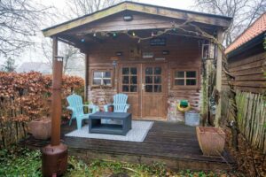Via de keuken kom je tenslotte nog in de uitbouw. Hier bevindt zich het toilet en nog een werkkamer. Het is een fijne plek om te werken met zicht op de vogels in de tuin en door de vele ramen aan twee zijden plezierig licht.