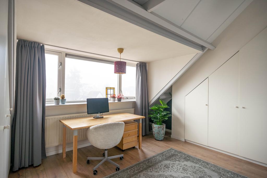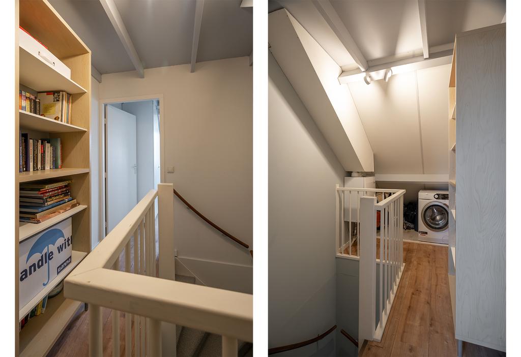Op de voorzolder vind je de aansluitingen voor wasmachine en droger en veel bergruimte. Verder vind je hier een grote slaapkamer van maar liefst 20 m2. De kamer beschikt over veel vaste kasten en het grote raam van de dakkapel geeft een fantastisch uitzicht over de wijk, het bos Klein Zwitserland en de kerktoren. Je zou op deze verdieping ook nog een tweede slaapkamer kunnen creëren.