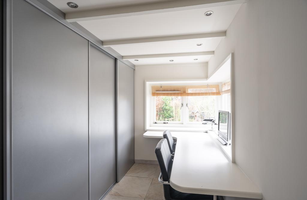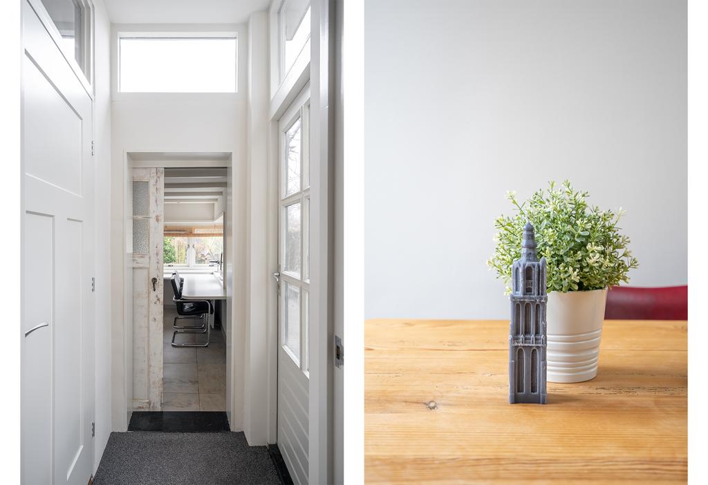 Via de keuken kom je tenslotte nog in de uitbouw. Hier bevindt zich het toilet en nog een werkkamer. Het is een fijne plek om te werken met zicht op de vogels in de tuin en door de vele ramen aan twee zijden plezierig licht.