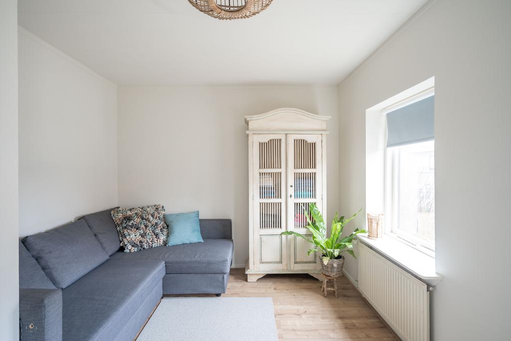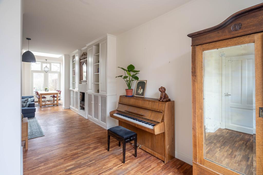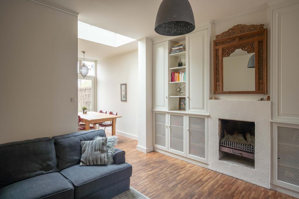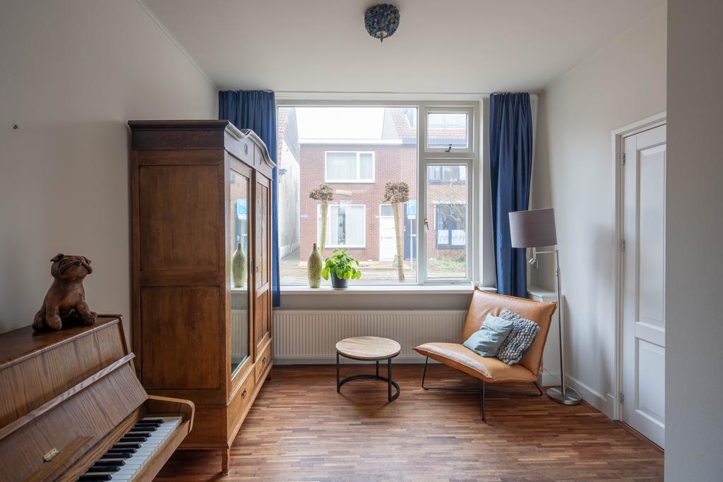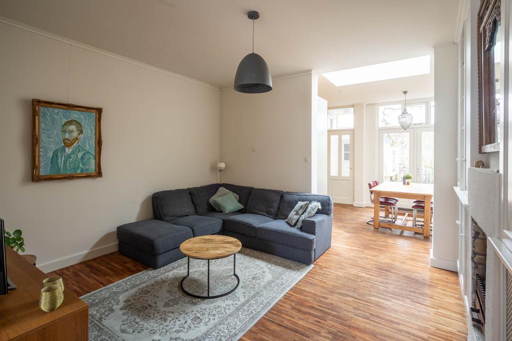 De woonkamer is voorzien van een houten vloer en de grote ramen en hoge plafonds geven veel licht en een ruimtelijk gevoel. Aan de voorzijde heb je een fijne plek voor een leesstoel of speelplek voor de kleintjes. Loop je door naar achteren dan kom je in de ruime zitkamer, die is gecentreerd rondom de haard.De houthaard geeft sfeer en warmte voor de gezellige winteravonden en is de ideale plek voor een grote zitbank.