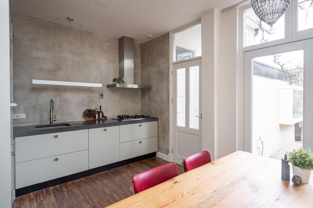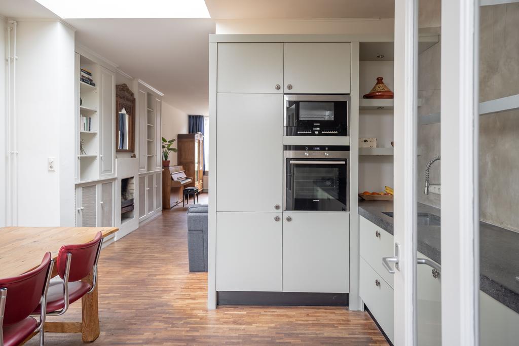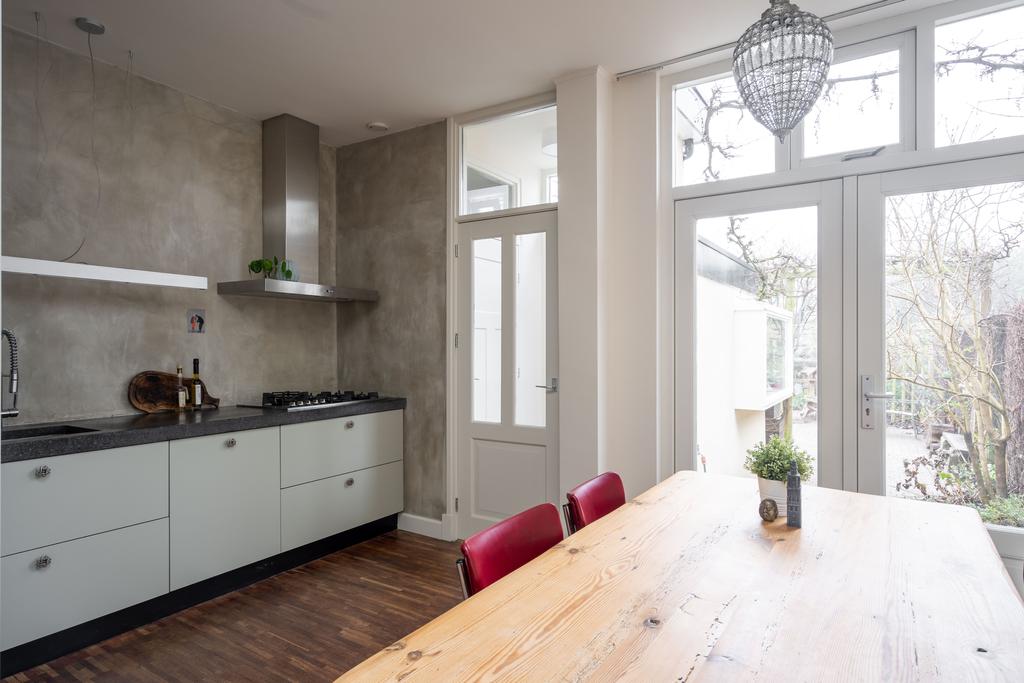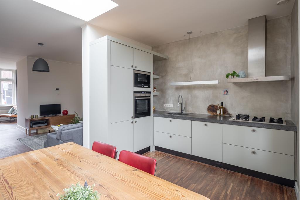 De woonkamer gaat over in de half open keuken aan de achterzijde van het huis. De keuken heeft een mooie warme groengrijze kleur op de kastjes, een natuurstenen werkblad, en diverse inbouwapparatuur zoals een vijfpits-gaskookplaat, koel- vries combinatie, vaatwasser, magnetron en oven. Ook is hier plek voor een grote eettafel. Door de lichtstraat in het plafond vang je hier volop licht. De openslaande deuren in de achtergevel mogen natuurlijk niet ontbreken. Deze leiden naar de grote en diepe achtertuin.
