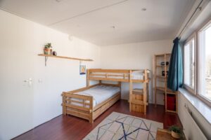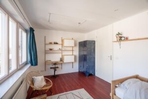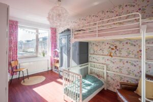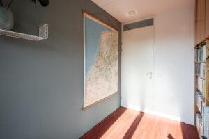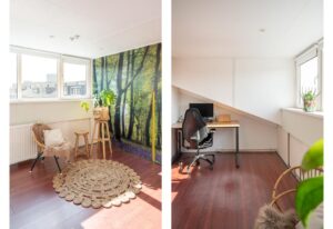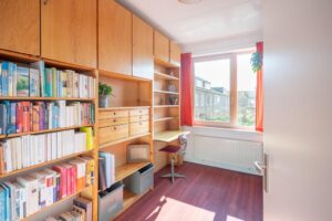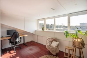 De kamer aan de voorzijde is 14 m2 groot en plezierig licht door de grote raampartij. Vanuit deze kamer kom je met een vlizotrap op de bergzolder: een ideale plek om spullen weg te zetten.