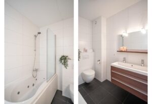De badkamer is netjes afgewerkt met een fraaie grote witte tegel op de wanden en een donkergrijs betegelde vloer. Verder beschikt de badkamer over bad/douche met jacuzzi, een hangend closet, designradiator en een dubbele wastafel met meubel.