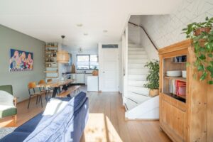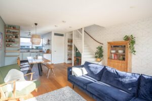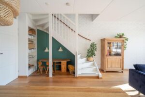 Als je de woonkamer binnenkomt, zie je aan de linkerkant de trap naar boven. Onder de trap is een speelplek voor de kinderen gecreëerd. Dat is pas optimaal gebruik maken van de ruimte; uit het directe zicht maar er toch gezellig bij kunnen zijn! Wil je hier toch liever een traditionele trapkast, dan is dit weer eenvoudig dicht te maken.